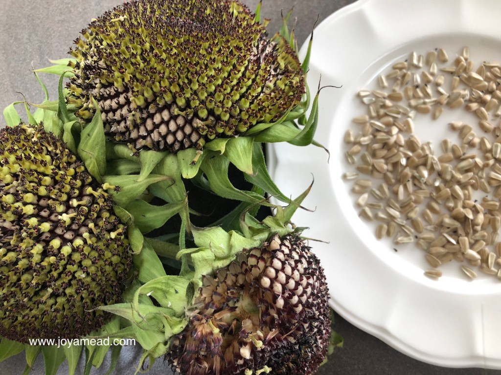 With some of the dead flower heads removed, I have been drying them out to save the seeds for the next season. Having a chance to observe up close each sunflower head, I am amazed at the hundreds of new seeds on just one flower. I think we could nearly have a sunflower farm if we decided to plant them all!