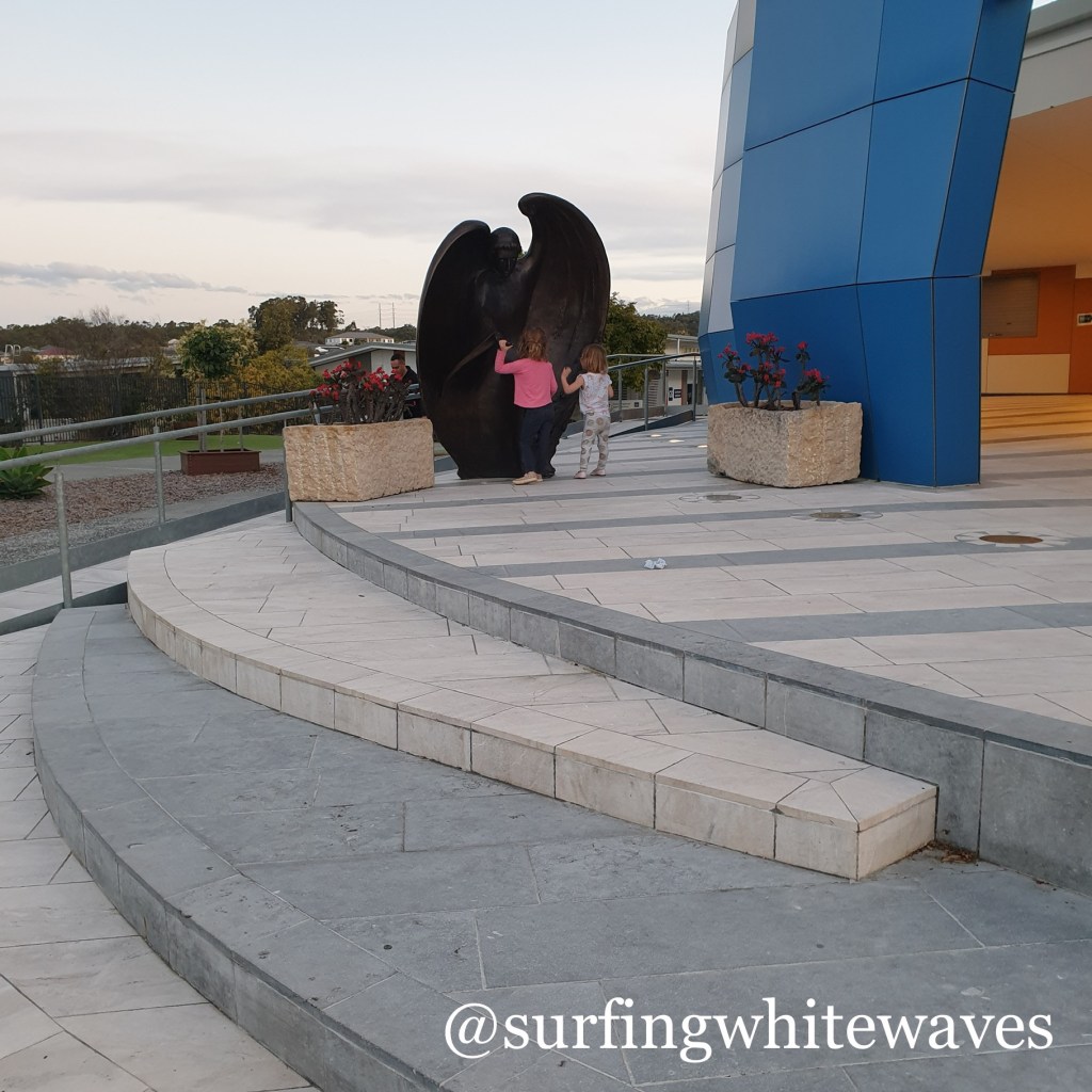 Madeline gives Francesca a cuddle before we go and my two girls race each other through the corridor, out the gate and past the church to where a statue of an angel stands.